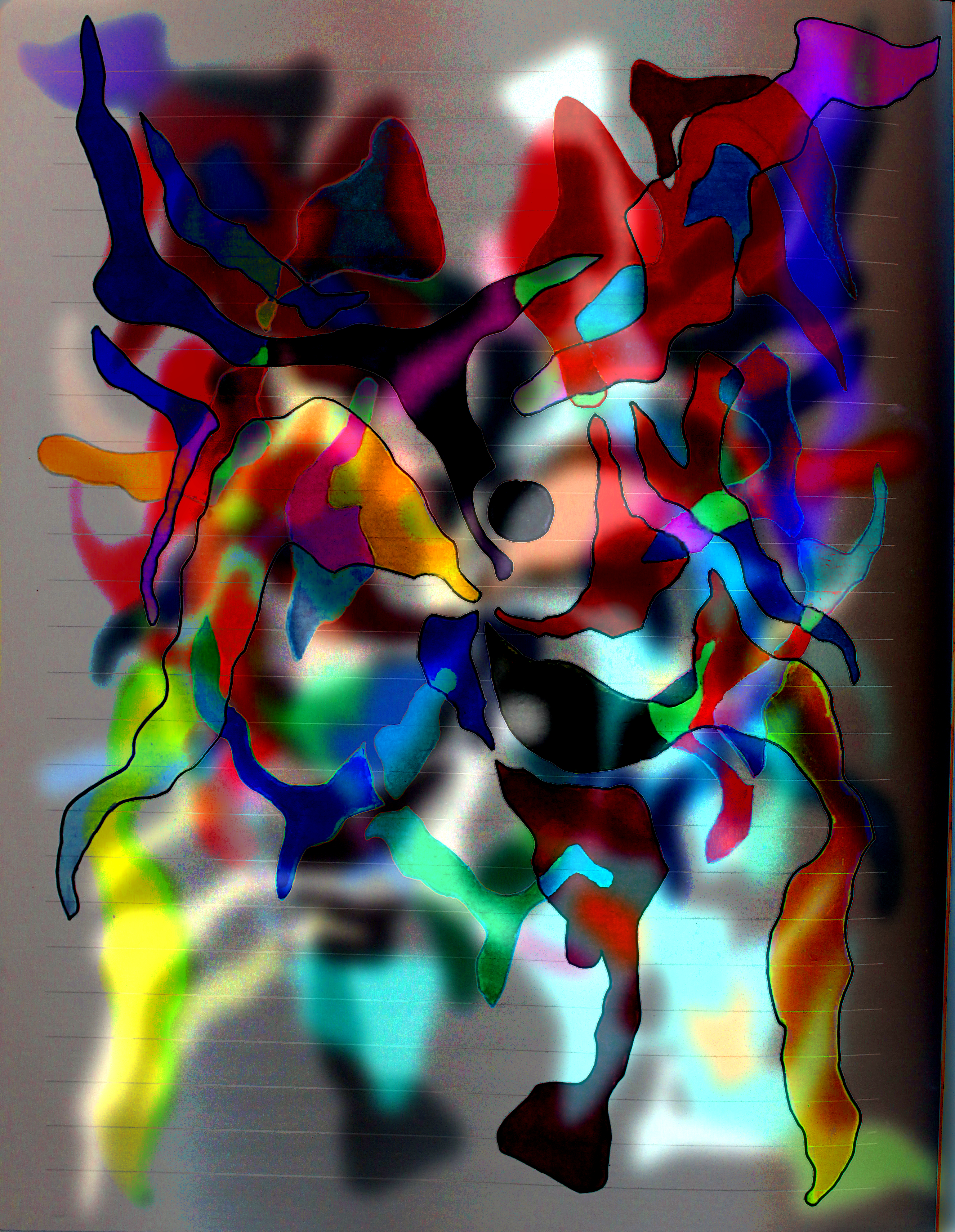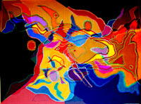 Sans réfléchir, tracer des lignes ; les courber, les incliner, les tordre, les ondoyer ; les faire se croiser ou se joindre ; puis, méthodiquement, remplir de couleurs les surfaces aux contours non-identifiables ainsi créées et, pas à pas, les saturer.