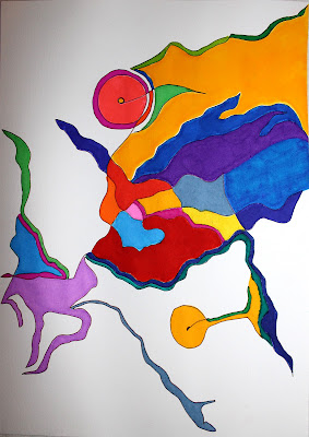 Enfin, sous l'intitulé "couleur automatique", plusieurs séries de dessins automatiques, peut-être bien visionnaires. Que cela soit au crayon, au stylo, au pastel ou au feutre, aucune technique particulière, si ce n'est le laisser-venir de formes colorées - a priori mystérieuses et indéfinies. Lesquelles, a postériori, pourront être identifiées selon des modes imaginaires libres et personnels.